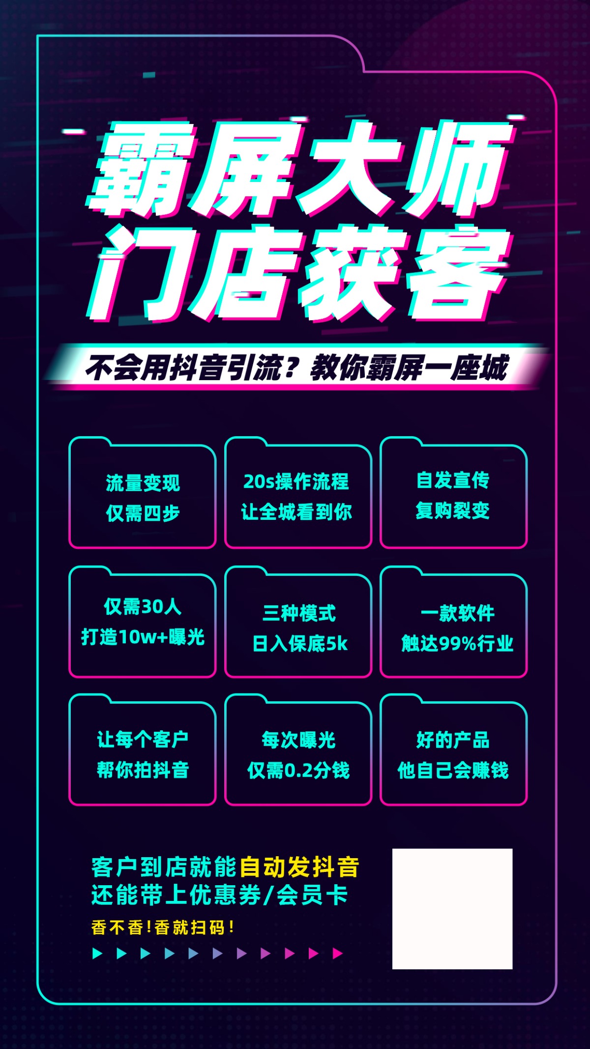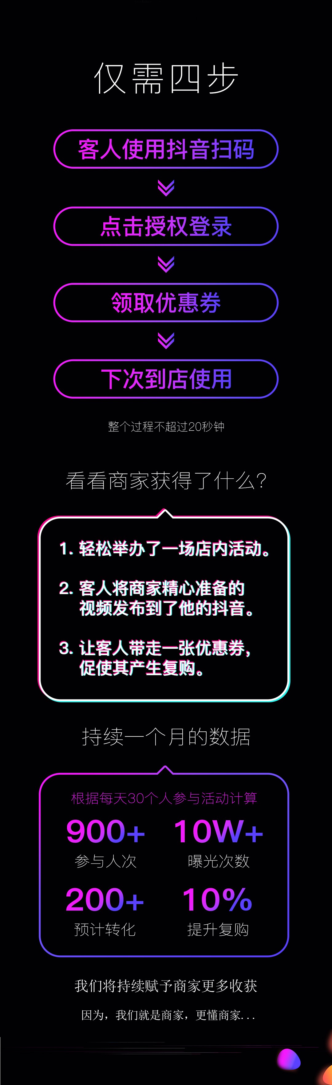 商家只需要事先把制作好的抖音短视频上传即可,活动后台生成一个活动二维码,然后印刷成海报或者宣传单页,消费者到店或者通过其他宣传方式扫码领店铺优惠券,同时会自动发布一条我们准备好的广告视频到他的抖音!