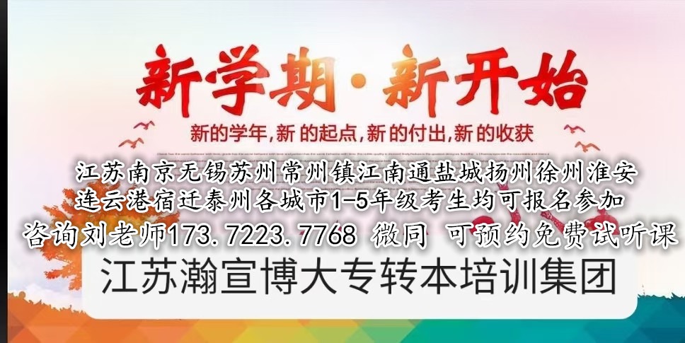 江苏瀚宣博大专转本学校专业从事五年制专转本培训辅导,实力雄厚、管理科学、教学经验丰富、课时安排合理,通过率高,倾注于专转本教育14年,根据考生的不同基础情况和接受能力开设五年制专转本强化班、集训班、寒暑假班、周末班、考前班等多种班次,签约协议有保障,并通过日常周测、月考、后期大型模拟考实时了解学生的学习进度,并进行合理化的志愿填报指导,进而有针对性的培训。江苏瀚宣博大专转本全年滚动开班,常年招生,1-5年级考生均可报名参加,一次报名可循环上课至考前,打牢基础,提高转本通过率!更多详情咨询联系瀚宣博大专转本刘老师173(微)7223(同)7768,可预约免费试听课,领取招生简章一份。