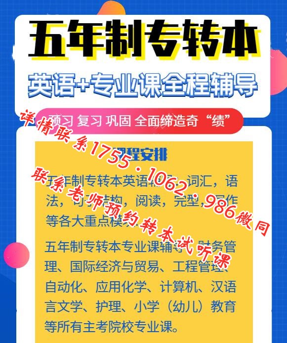 江苏瀚宣博大专转本学校从事五年制专转本辅导14年,有五年制专转本英语和所有主考院校专业课辅导,英语辅导词汇、语法、阅读、写作等所有模块,讲考点学重点,多轮复习备考巩固知识点,专业课辅导会计学、旅游管理、计算机、土木工程、机械电子工程、护理、动画等所有主考院校专业课,详情联系瀚宣博大宋老师1755(微)1062(信)986了解,联系老师预约转本试听课。