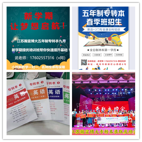 目前江苏瀚宣博大专转本寒假班正在火热招生中,小班化教学,针对性辅导,效果更好,我们根据考生的不同基础情况提供五年制专转本考试政策的专业咨询、各大主考院校的详细介绍、统考英语的辅导、专业课精准考纲提供、专业课的教学(辅导主考院校所有专业课,报考哪个院校哪个专业就辅导哪个专业)、统一报名、集体送考、通过率更高的志愿填报等一系列流程化服务;管理严格、打卡签到、提高出勤率,及时反馈学生在学习过程中出现的问题。课程设有寒暑假集训班、周末班、考前集训班等各种不同班次,合理安排课时,因材施教。让考生对五年制专转本的了解更加深入,更加有方向性和针对性,学员在这里只需要安心认真学习。更多内容联系武老师:176(微)0255(同)7316,领取招生简章及试听课。