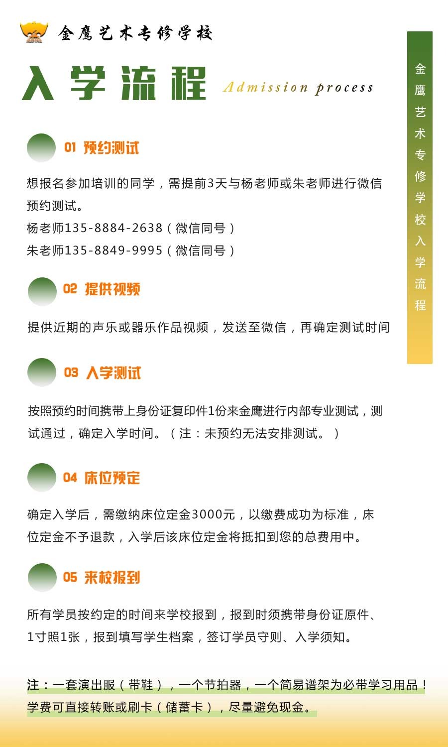 金鹰艺术专修学校即杭州杨妈艺术培训有限公司,属于同一家音乐艺考培训学校。学校创办于2004年,至今已有十多年的建校史,现已拥有一直成熟的教学管理团队。学校每年为各大音乐学院,知名艺术学院,重点综合类大学等输送了一批优秀音乐学子。以“浙音”为例,现有73余名(2015-2021届)学子就读于浙江音乐学院, 其中音乐教育专业22人、作曲专业27人、流行专业12人、音乐表演12人。