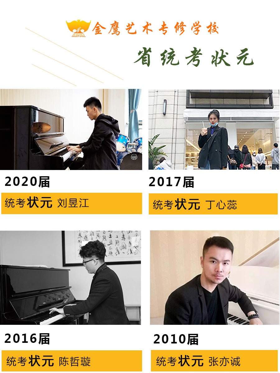 金鹰艺术专修学校4次夺得省音乐统考状元,分别是2010届的张奕诚、2016届的陈哲璇、2017届的丁心蕊、2020届的刘昱江。学校三位长期班学员(丁心蕊,陈璐亚,虞佳音)在音乐联考中取得视唱练耳单科99分状元(总分100分)。