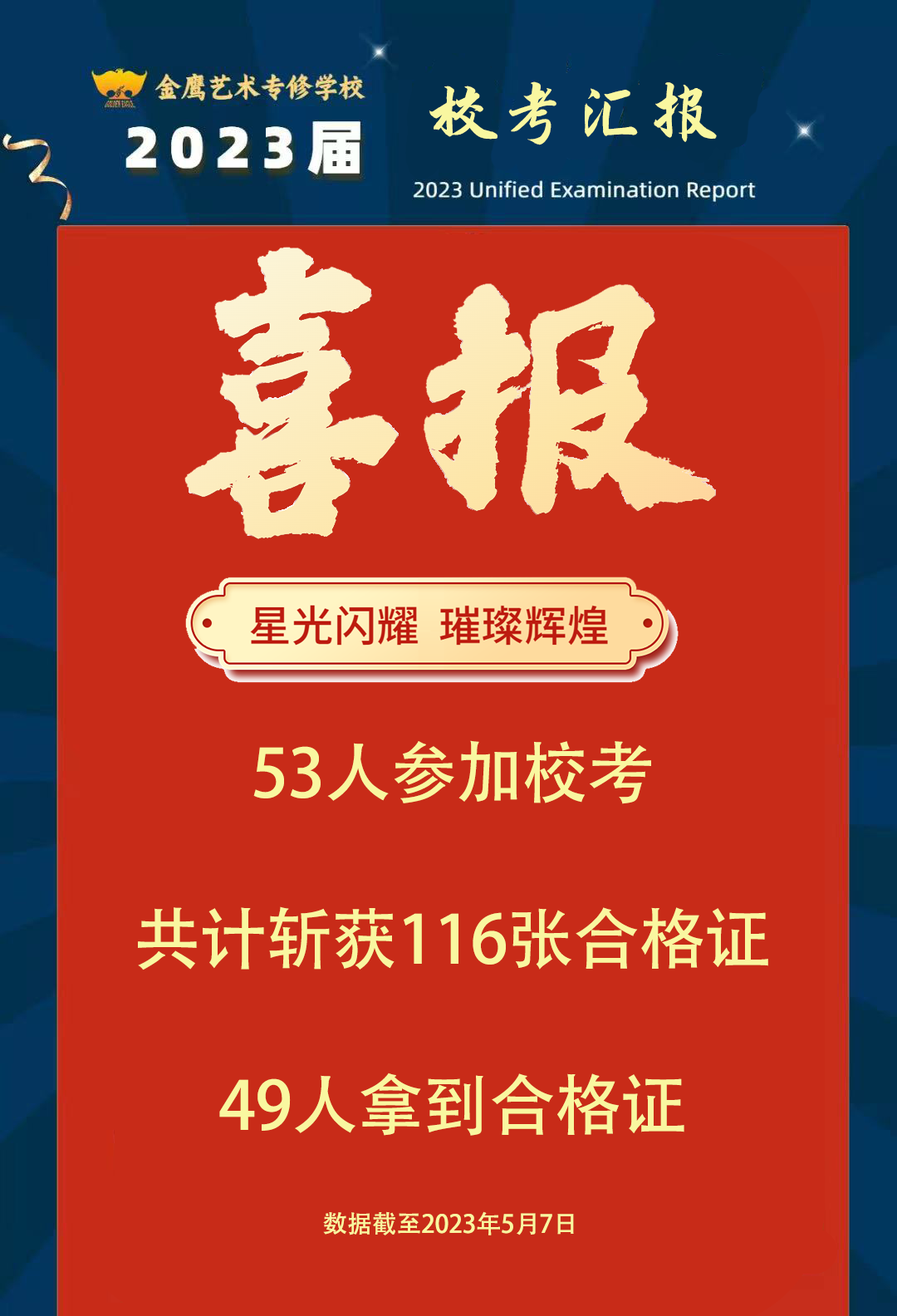 金鹰共有53人参加校考,女生32人,男生21人。截止目前,已有48人拿到合格证,共计斩获107张合格证。上海音乐学院参考2人,斩获2张合格证,且2张均是探花(全国第2名);中国音乐学院参考1人,斩获1张合格证;中国传媒大学参考2人,斩获3张合格证;哈尔滨音乐学院参考2人,斩获2张合格证,并勇夺状元(外省第1)和探花(外省第3)殊荣。其他15所音乐院校参考40人斩获99张合格证!(院校陆续放榜中,榜单将持续更新)