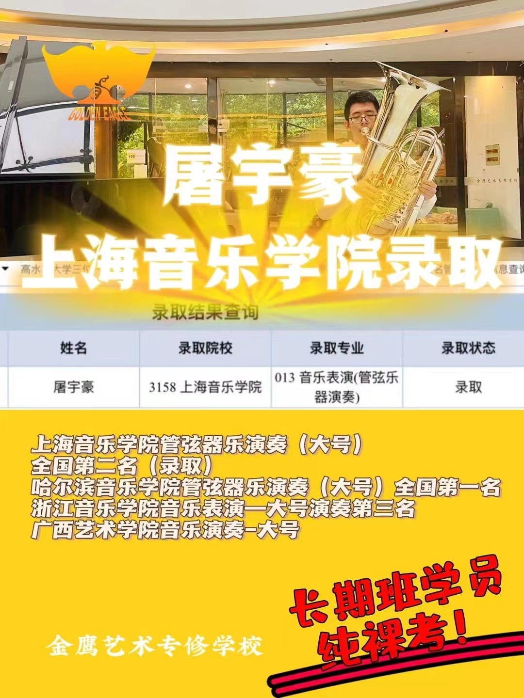 对很多宁波慈溪音乐艺考生而言,2023年的音乐艺考是竞争力极强的一次考试。作为浙江老牌艺考培训机构,金鹰艺术专修学校也经历了巨大的挑战,23届金鹰学子经历了重重考验,但最终经受住了艺考路上的重重考验,用一份份艺考成绩和数据,为家长、为自己、为未来、交出了一份满意的音乐艺考答卷。