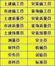 九大员分别是:资料员、标准员、施工员、质量员、预算员、安全员(新考取消了年审可以继续)、材料员、机械员、劳务员、试验员、测量员