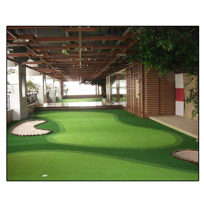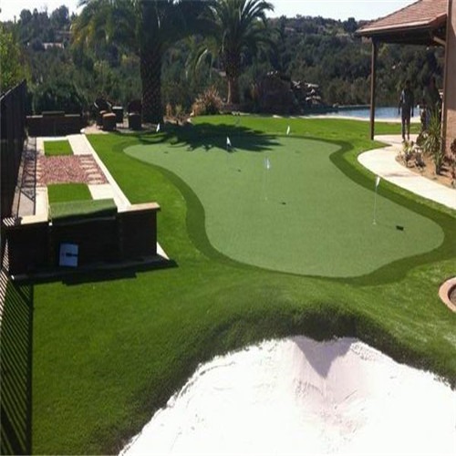 高尔夫人工果岭可以常年保持绿色,抗老化优异,使用17mm,密度65000簇的纯曲丝人造草坪,色牢度高,,耐磨损,透水性好,如果场地面积允许、可以搭配30mm到40mm的休闲人造草坪,让果岭场地的美观度进一步提升。