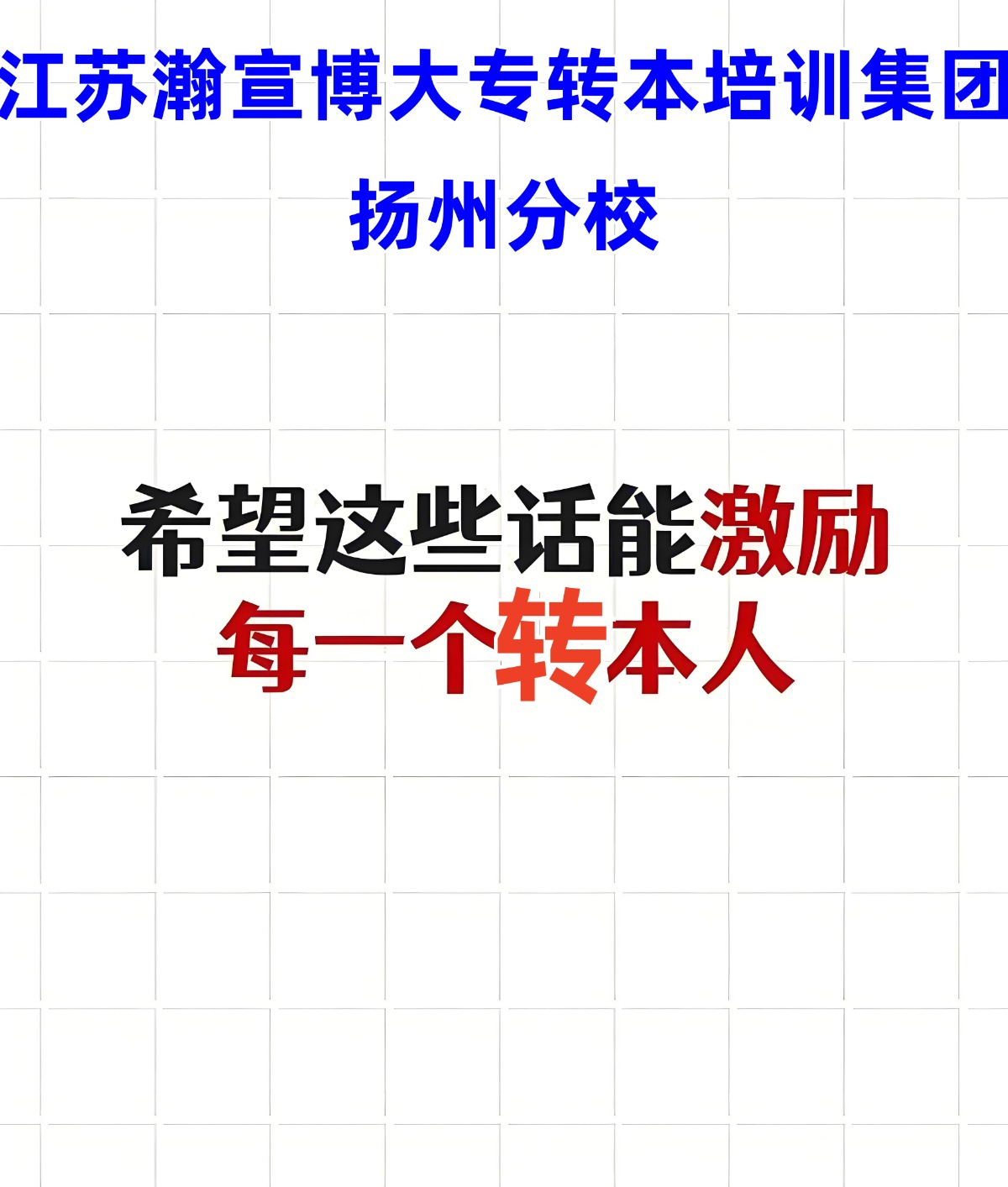 如果你也想在专转本考试中取得优异成绩,实现自己的本科梦想,不在英语这个必考学科上落于人后,那么请选择瀚宣博大,江苏各市均有校区,同学们可就近报名,扬州地区看这里,扬州市广陵区东城国际大厦15K,让我们一起努力,共同迎接美好的未来!