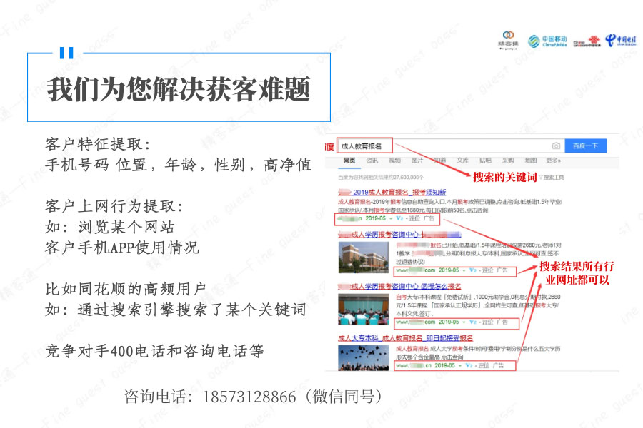 精客通是国内领先的保健品电话数据资源服务商,有非常丰富的数据分析挖掘能力,和中国联通、移动、电信三大运营商达成战略合作,借助运营商大数据库,为各类企业、商家、微商提供精准客户源。