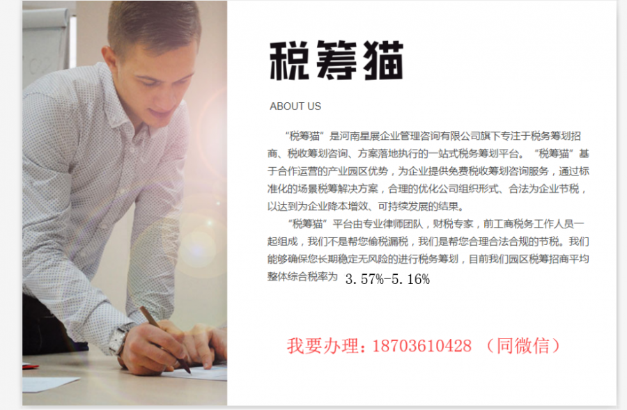 主营产品或服务: 公司主要经营税务筹划,税筹猫,财税咨询, 地方政府为发展经济,会建立一些产业园,为吸引企业入住,会给入住企业税收方面的优惠,现与我们签订合同,委托我们作为第三方平台帮助其进行全国招商。“税筹猫”平台由专业律师团队,财税专家,前工商税务工作人员一起组成,我们是帮您合理合法合规的节税。我们能够确保您长期稳定无风险的进行税务筹划。无需企业实体入住,仅仅是注册即可享受核定征收政策,帮助企业解决企业所得税。目前园区整体综合税率为3.57%-5.16%